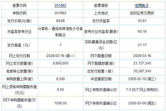 宏明电子2026年3月13日披露的首次公开发行股票并在创业板上市发行公告显示,按本次发行价格69.66元/股计算,公司广泛征集资金总额预计为211,678.21万元,扣除预计发行费用约7,914.74万元(不含增值税)后,预计募集资金净额约为203,763.47万元。