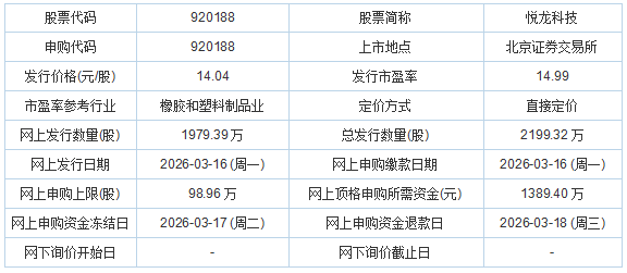 悦龙科技2026年3月12日披露的向不特定合格投资者公开发行股票并在北京证券交易所上市发行公告显示,若这次发行成功,预计公司广泛征集资金总额为30,878.45万元,扣除发行费用3,120.62万元(不含增值税)后,预计募集资金净额为27,757.83万元。